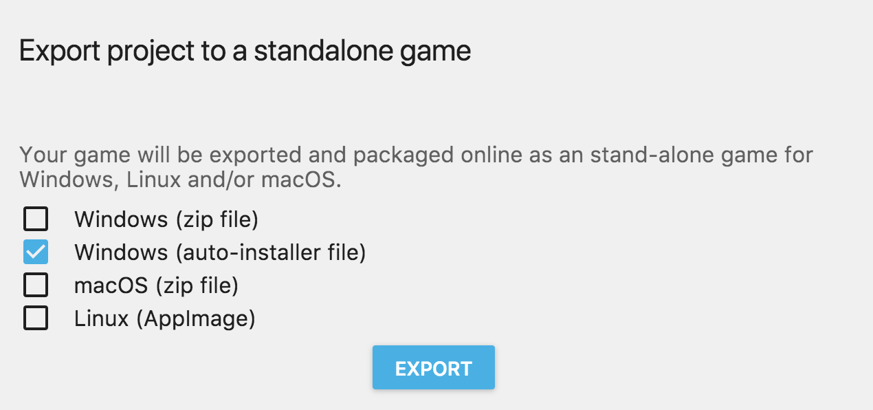 Elige las plataformas para las que quieres exportar el juego. Para Windows, puede elegir si desea un solo archivo ejecutable o un archivo zip: