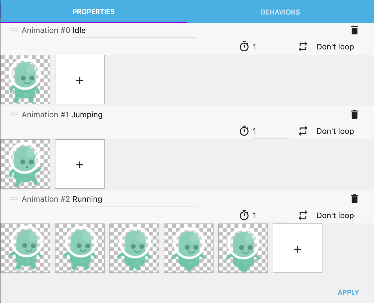 Abra el editor del objeto Player y asegúrese de estar en la pestaña Propiedades. Luego haga clic en el botón + en la parte inferior de la ventana para agregar una animación. Finalmente, haga clic en la miniatura con el signo + de la nueva animación y elija p1_jump como la imagen a agregar: