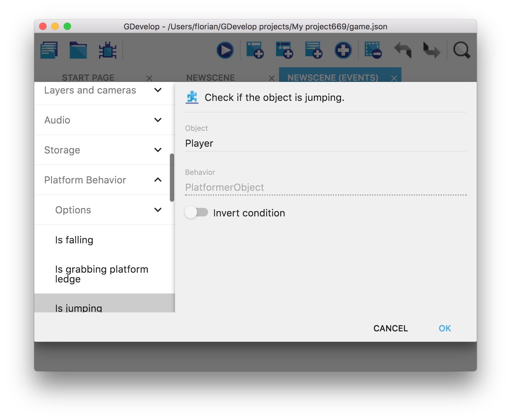 La parte derecha de la ventana muestra los parámetros necesarios para configurar la condición. Aquí, queremos comprobar si el objeto "Jugador" está saltando, así que elija Jugador para el primer parámetro (el segundo se llena automáticamente):