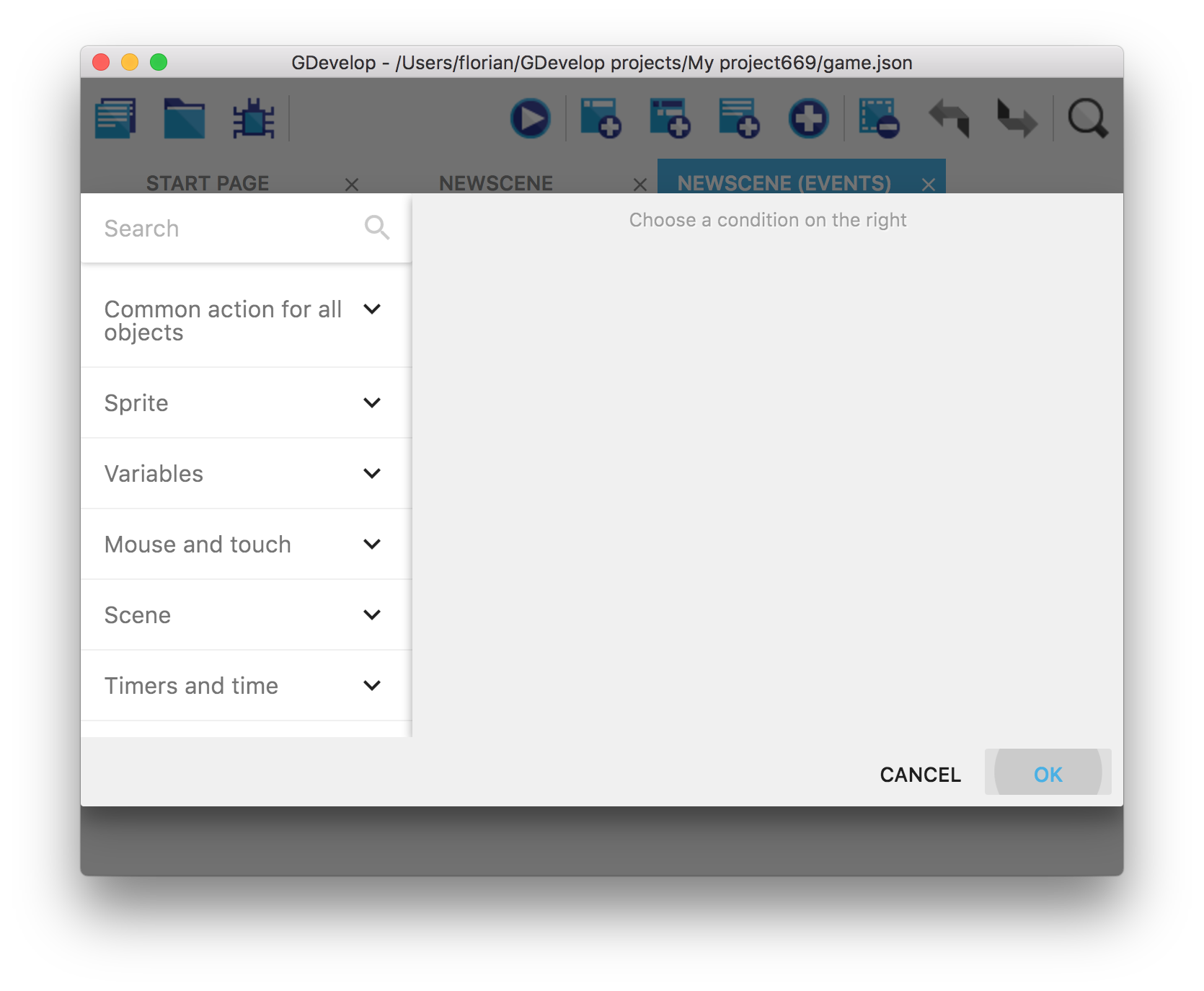 Un evento se compone de una lista de condiciones (por ejemplo, para verificar si se está produciendo una colisión, si se presiona una tecla, si la vida del jugador es baja, etc.) y una lista de acciones que suceden cuando se cumplen las condiciones.