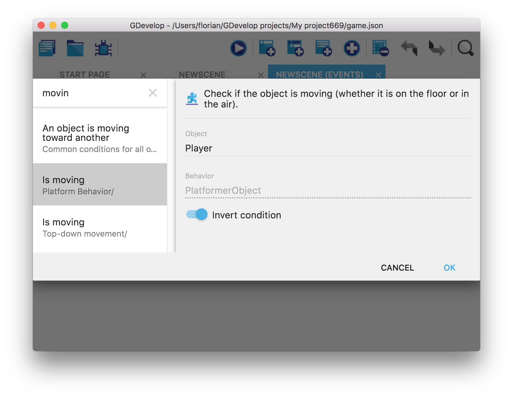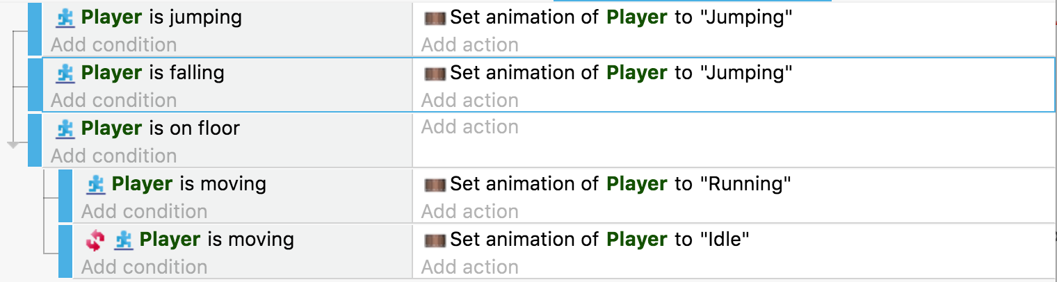 Para la segunda, agregue la misma condición, pero marque la opción 'Invertir condición'. De esta manera, las acciones del evento se iniciarán cuando el objeto del Jugador NO se esté moviendo: