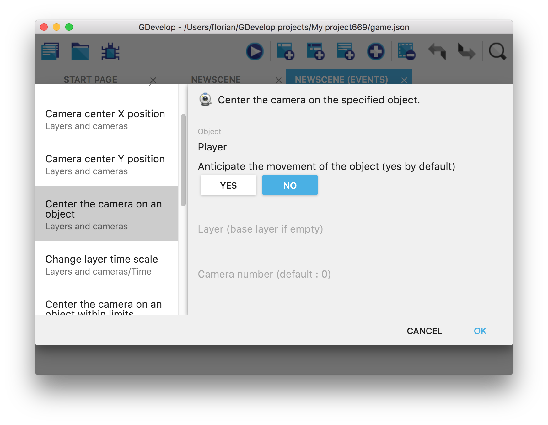 - Dans la liste des actions, sélectionnez Layers and cameras puis Center the camera on an object. Laissez les paramètres par défaut et cliquez sur OK*.