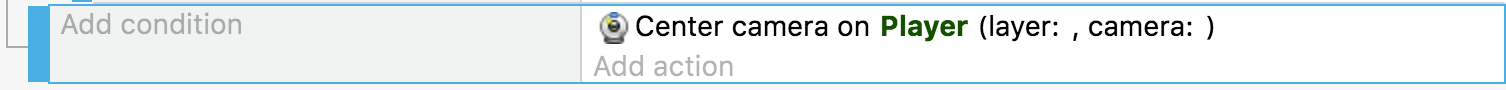 Ajoutons un autre événement pour que la caméra suive le joueur. Il y a plusieurs façons d'y parvenir. Le plus simple est d'ajouter un événement sans condition et de mettre l'action appelée Center the camera on an object :