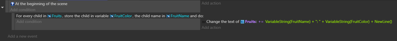 This event stores the value of each child variable (as a string or number) and the name of the child variable (as a string) into scene variables. The names of these scene variables are defined in the event parameters.