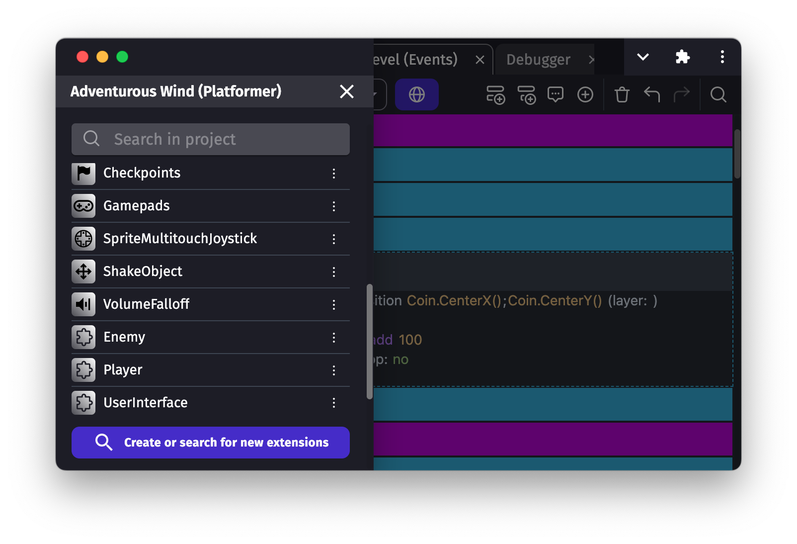 Games can be enriched by extensions that can be created directly in a project. They can be made of Javascript events or standard events, as in the usual events sheets.