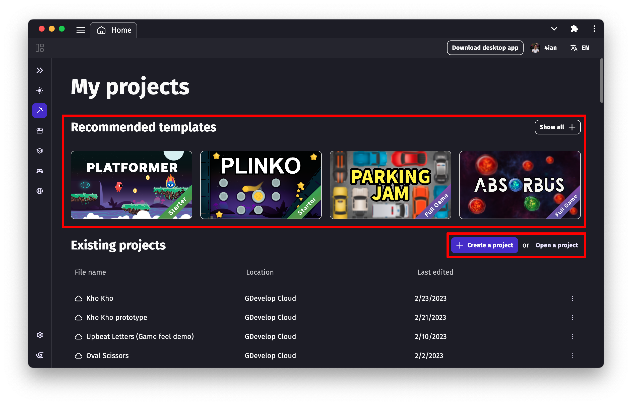 - Either open a Template to use as a starting point, or click Create a project to start from an empty project.