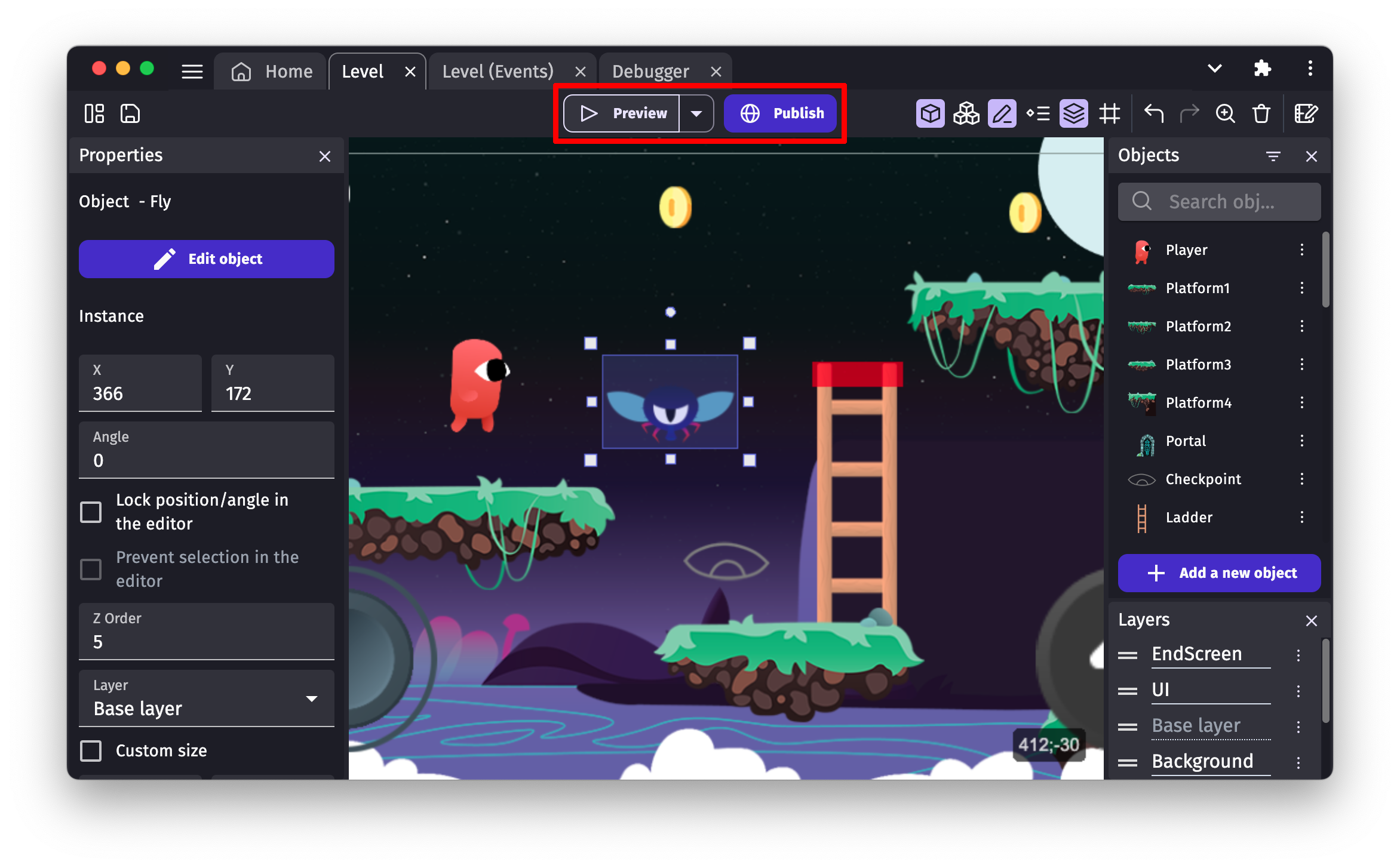 To preview your game from a mobile device, click the down arrow and select Start Network Preview. Then use a browser on your mobile device to visit the address that is displayed. Alternatively, you can click the publish button and generate a private web link for the game through GDevelop's games hosting platform gd.games.