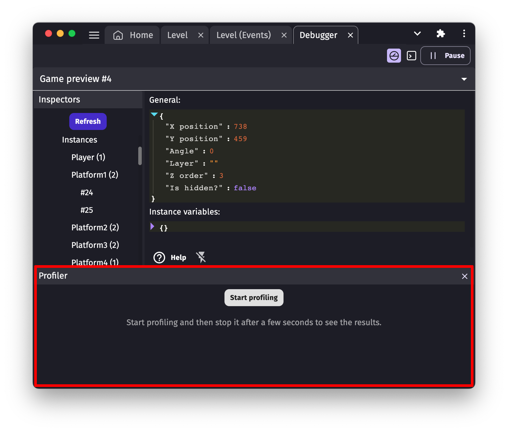 The Profiler is a tool that measures the time spent on different aspects of your game while it is running. It helps to find bottlenecks between your events and the rendering of the game that could be taking up a lot of resources.
