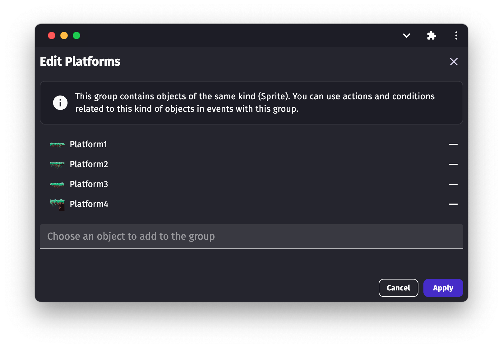 This makes it possible to create events that applies to lots of objects without repeating events multiple times, increasing performance of your game, maintainability, and readability of your events.
