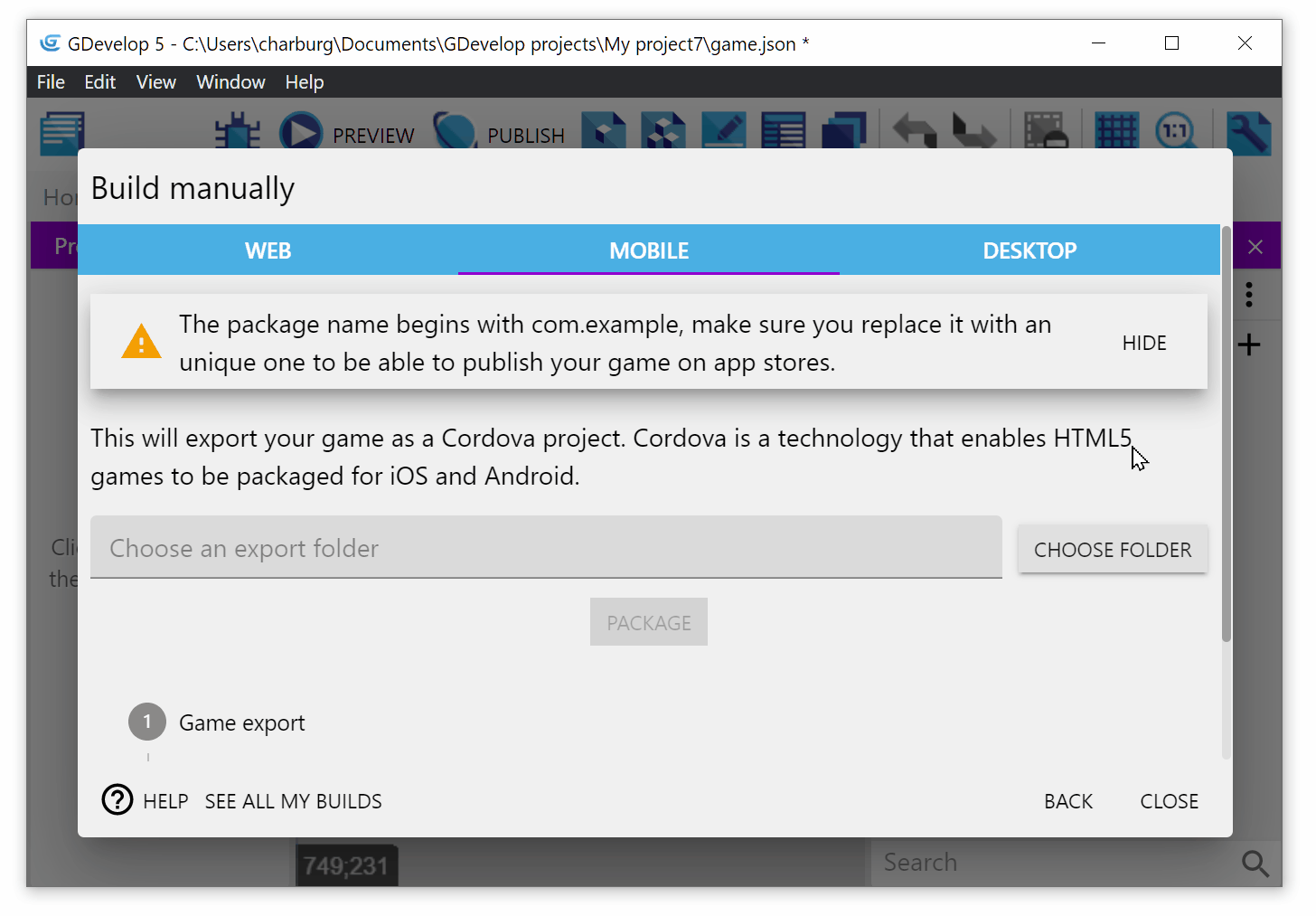 You can then click on Package. The game will be exported to a Cordova project. You can then use Cordova command line tool to generate an Android Studio project (for Android) or XCode project (for iOS) and build the game.