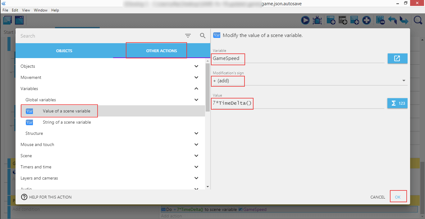 Add an action "Value of a scene variable", call it "GameSpeed", set the modifications's sign to + (add) and the value to 7*TimeDelta().