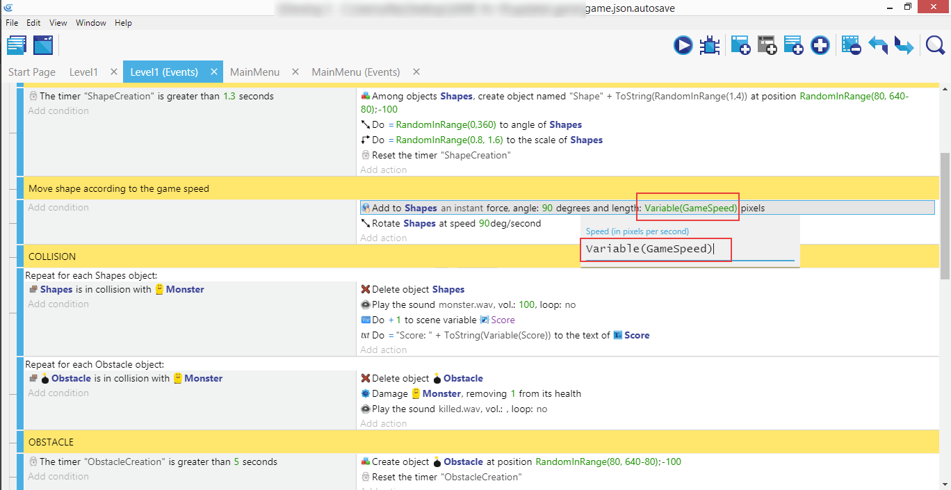 ...and then replace 100 pixels with 1.5*Variable(GameSpeed), so the bombs will fall even faster than the shapes.