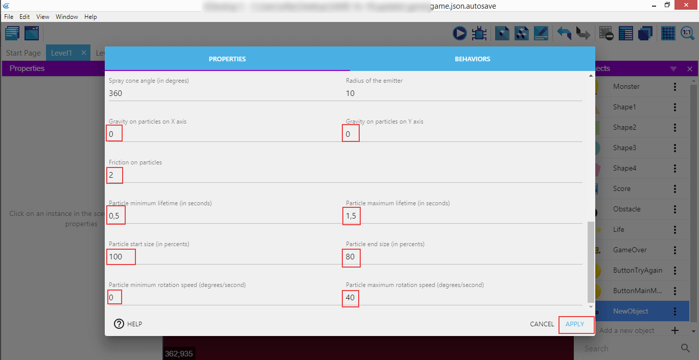 Those emitters will spawn small shapes as particles after the Monster collects it. Object's name will be "Shape1Explosion", kind of particles: "Textured", then select the geometry1.png image, and enter the respective values: start with 20 particles, their height will be 20 pixels, start and end opacity will be 255, so they will be fully visible.
