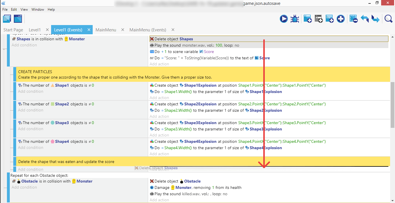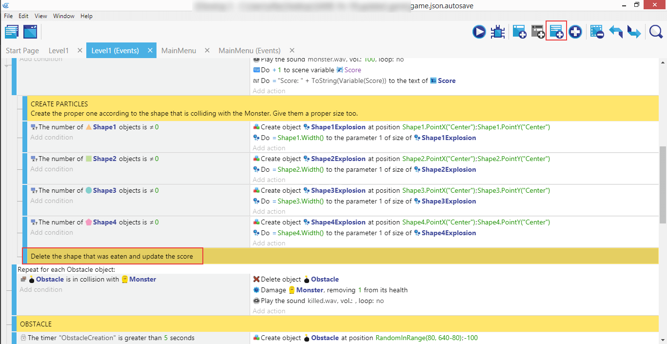 Now we're gonna add the sub-comment for the section about deleting the shape when it's being eaten, and we're going to move the part responsible for increasing the score.