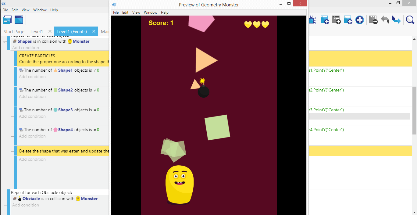 In this last piece we're introducing little bits that can make the game really stand out: progressively increasing the difficulty level, and spawning particle effects when Monster is collecting the shapes.