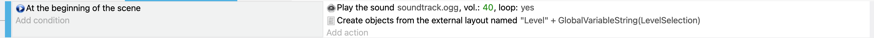 Add a new condition under the previous one to detect if the levels are unlocked or not. Select Levels object group, choose Current animation name option and enter Unlocked in the name field. Hence, we are preventing any problems regarding playing locked levels.