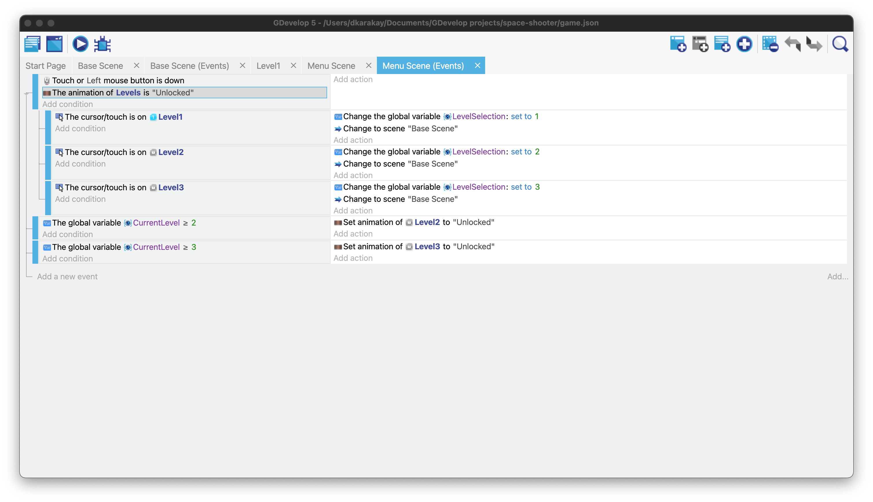 Create a new global variable called "LevelSelection" and set its initial value to 1. Then, change this variable to open the specific level (e.g., change it to 2 to load Level 2). Then add an action to run Base Scene. In the end, your events should look like this: