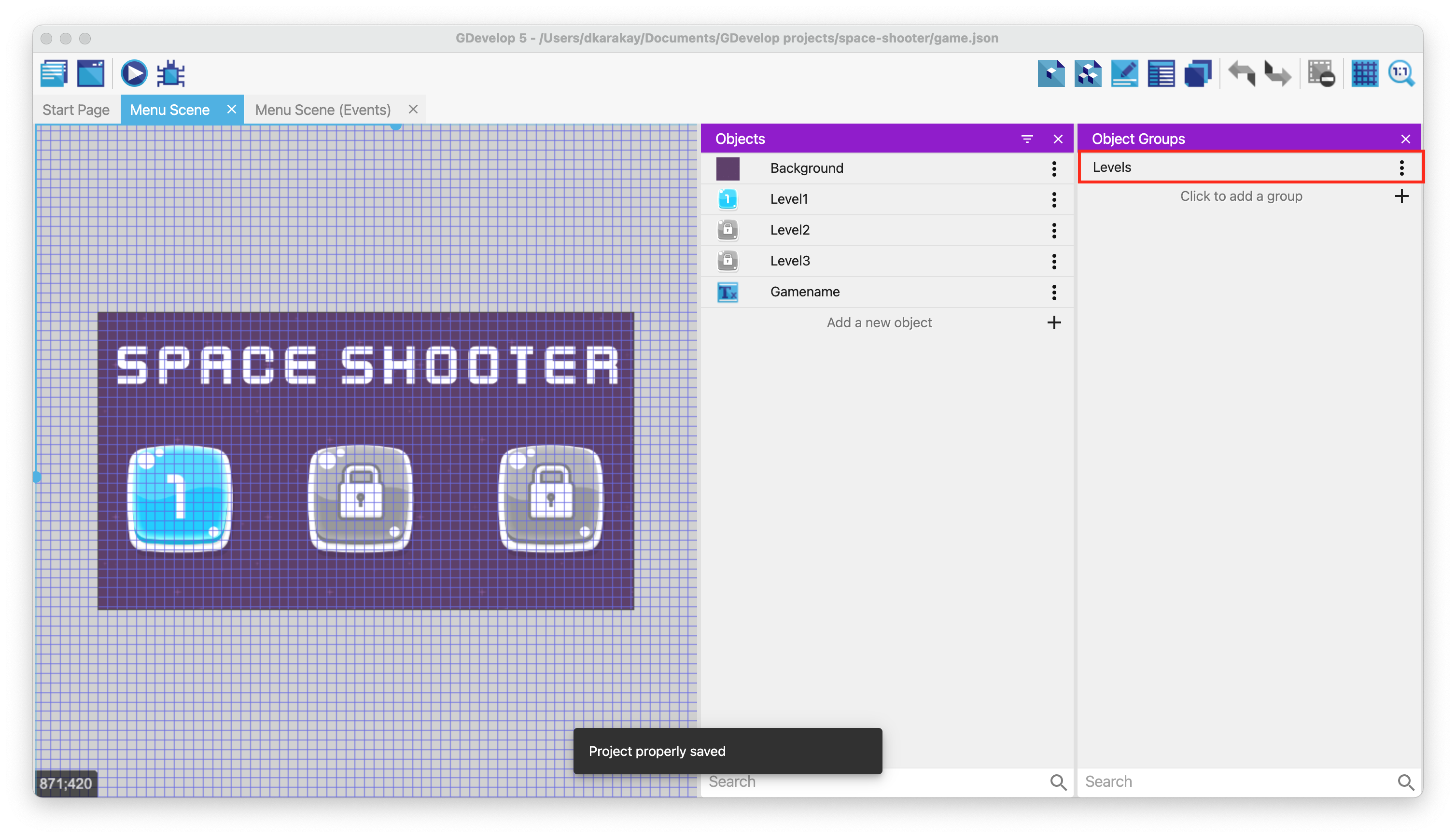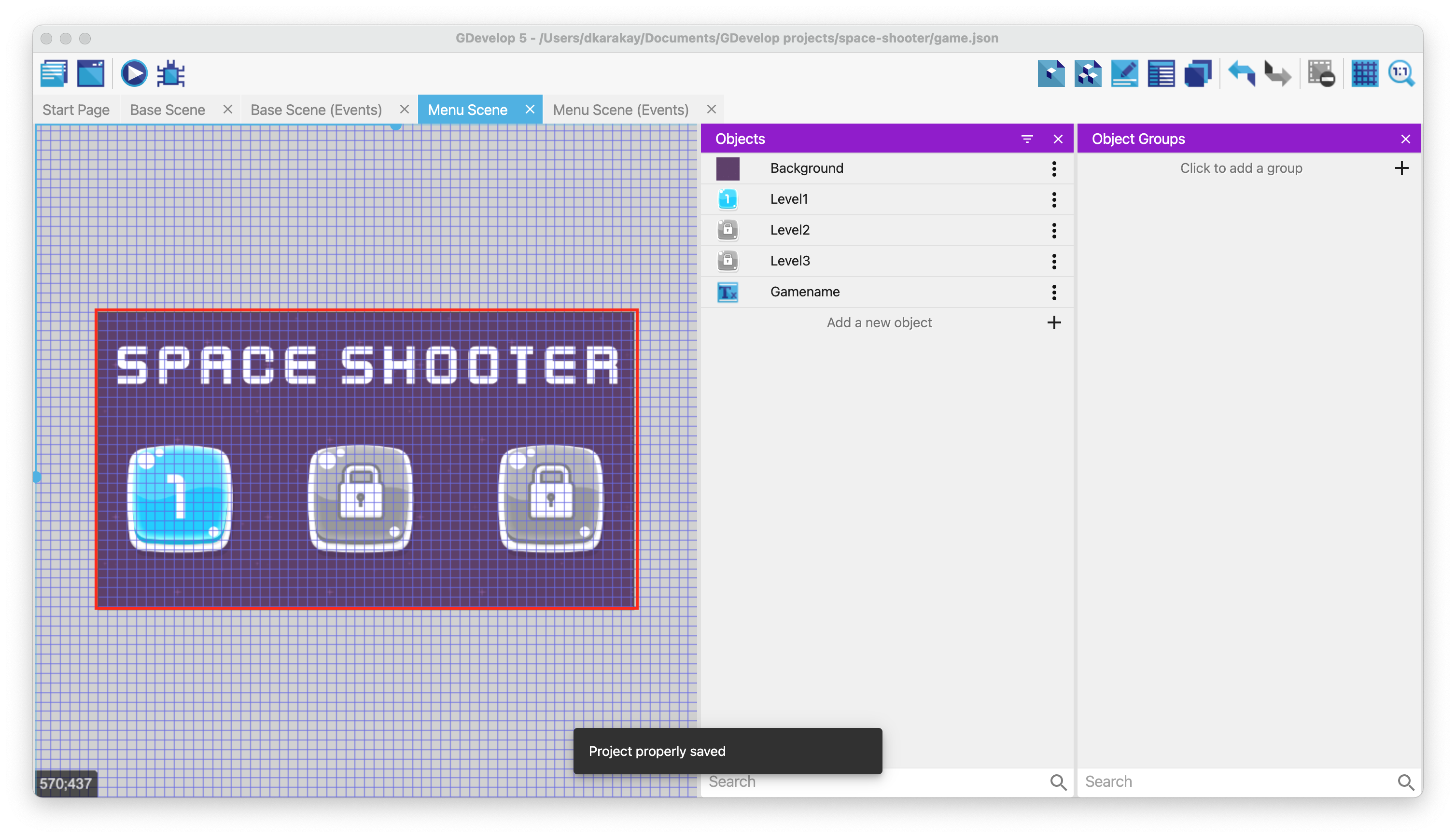 Repeat the last process to add Level3. Then, copy the Background object from Base Scene, as we did in chapter 11 to create explosion effects. In the end, your objects should look like this:
