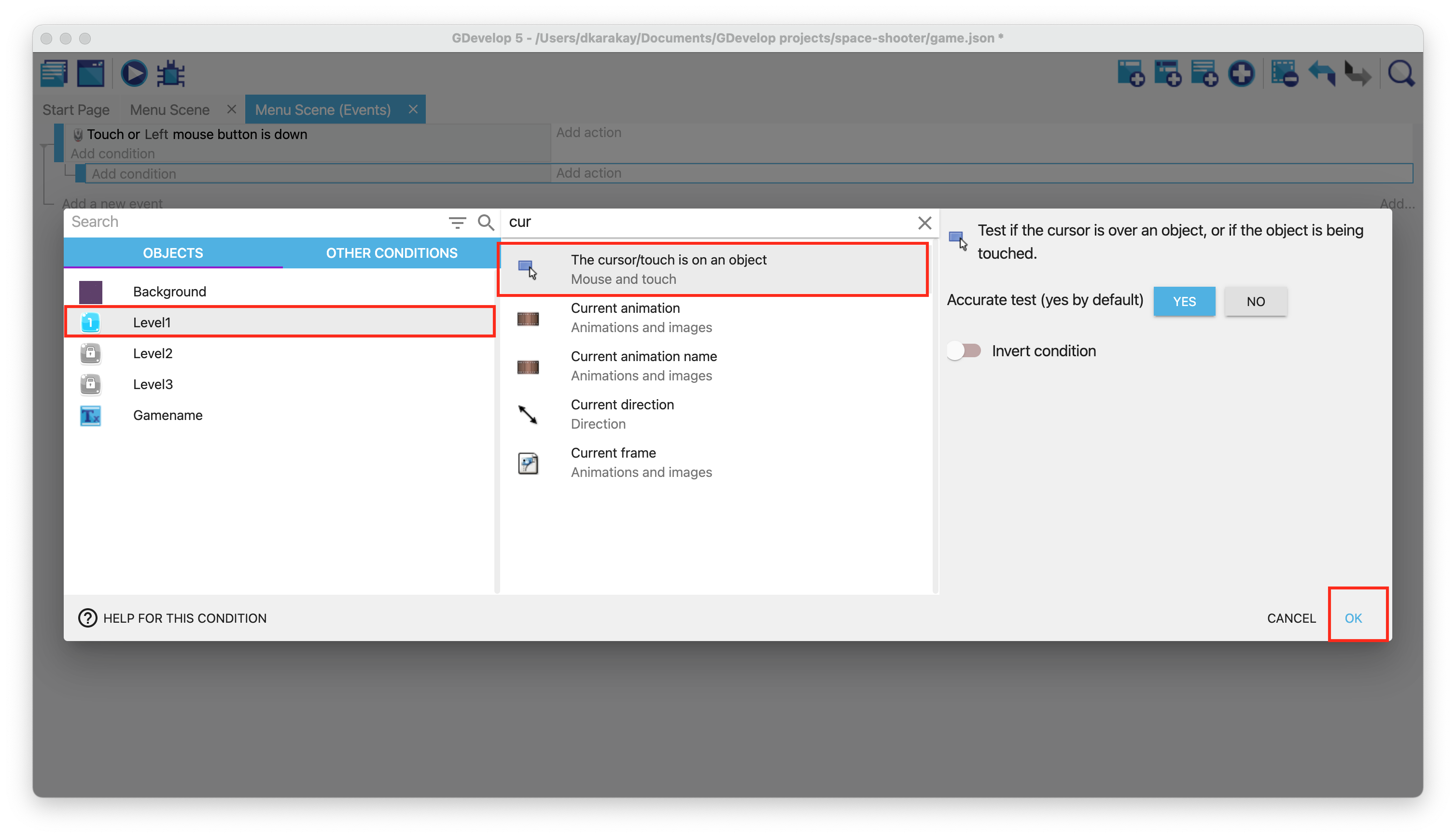 Then, add a sub-event. Choose Level1, and select The cursor/touch is on the object option.