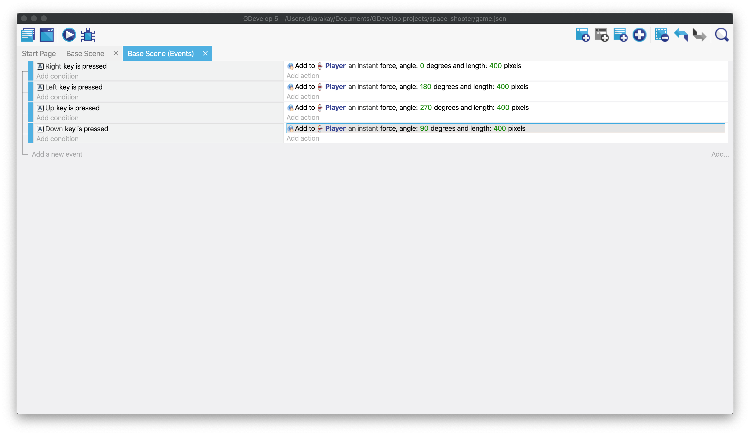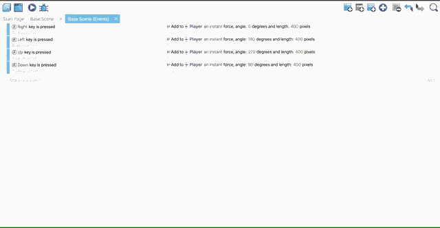 Then, click on Add Action in the same event and select Player since we want to move the Player. On the menu, select Add a force angle and enter the angle as 0, the speed as 400.