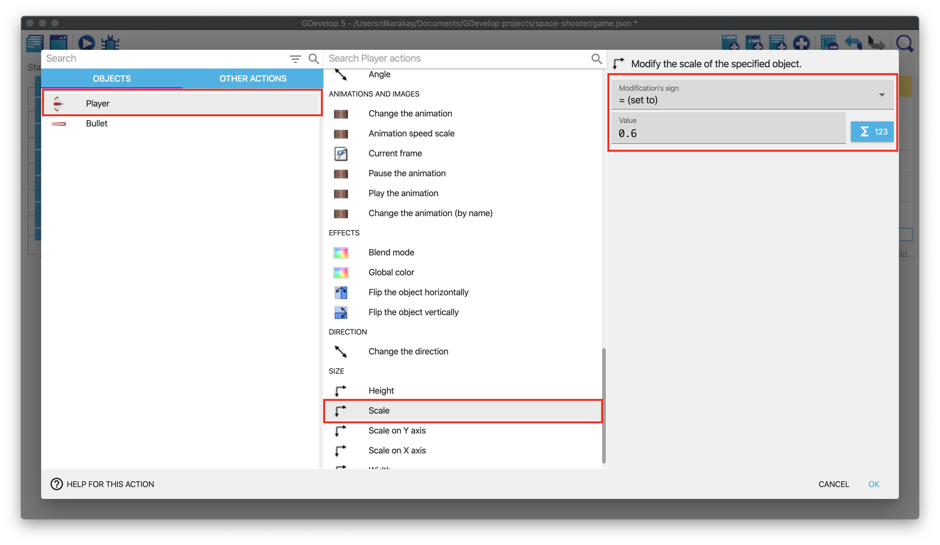 The player spaceship is a bit too big. We could resize it in the scene editor, but for this tutorial we'll use events. Click on Add a new action to change the scale of the player. Then, select the Player and Scale. Fill the value with 0.6.