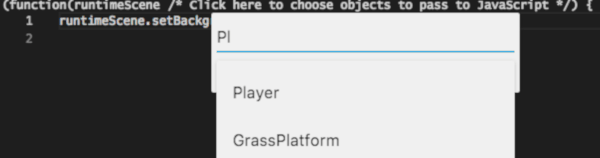 ほとんどの場合、アノテーションは必要ありません。ここで使うメソッドは、すでに型アノテーションによってドキュメント化済みだからです。しかし、オブジェクトリストを使うときに、そのオブジェクト特有のメソッドにアクセスしたいと思うかもしれません(たとえばスプライトオブジェクトのアニメーションを変更するメソッドとか)。そこでアノテーション /** @type {gdjs.SpriteRuntimeObject} */ を使うと、エディターが固有メソッドを認識できるようになります。