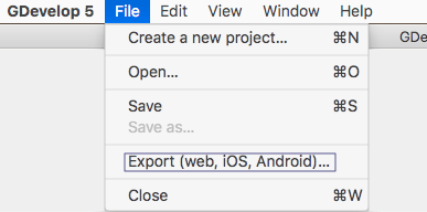 GDevelopを使用すると、AndroidやiOSを含むさまざまな形式でゲームを公開できます。ゲームをエクスポートするには、GDevelopインターフェースの上部にあるメニューから[ファイル]をクリックし選択します。任意のエクスポートオプションを選択します。この場合、 表示されるオプションのパネルからAndroidとiOSを選択します。
