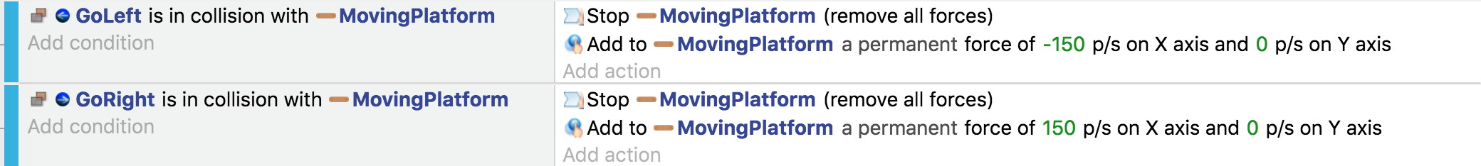 - 永続的なフォースはオブジェクトをずっと押し続けます。これを止めるには、オブジェクトを停止するアクションを実行する必要があります。停止アクションはオブジェクトに作用しているフォースをすべてクリアするため、結果的にオブジェクトは停止します(何かのビヘイビアが使われていたり、他のイベントによって位置が変更されたら、それはまた別の話です)。たとえば次の 2 つのイベントは、プラットフォームを 2 つのマーカーのあいだで移動し続けます。