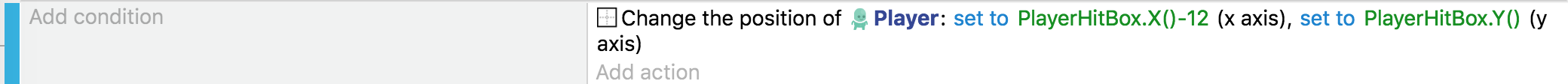 あるオブジェクトに他のオブジェクトと同じ動きをさせる、別の言い方をすると相対位置を固定するには、アクションを使ってオブジェクトの位置を変更します。ただし X 座標と Y 座標の値を式に計算させるのです。